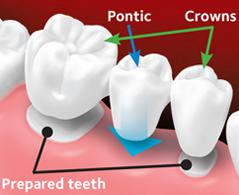 A bridge is similar to a crown in the material and how its prepared and placed. The main difference from a crown is that a bridge is used to help replace missing teeth. A bridge is a replacement tooth or teeth that fill the space where one or more teeth are missing. The bridge restores your bite and helps keep the natural shape of your face. A bridge is usually made from two crowns that hold on to a “dummy” tooth in the middle. This “dummy” tooth sits right on top of the gums to appear as natural as possible. Often a bridge is an alternative treatment for implants.